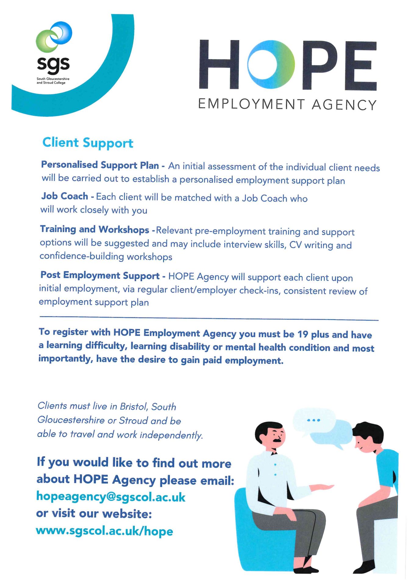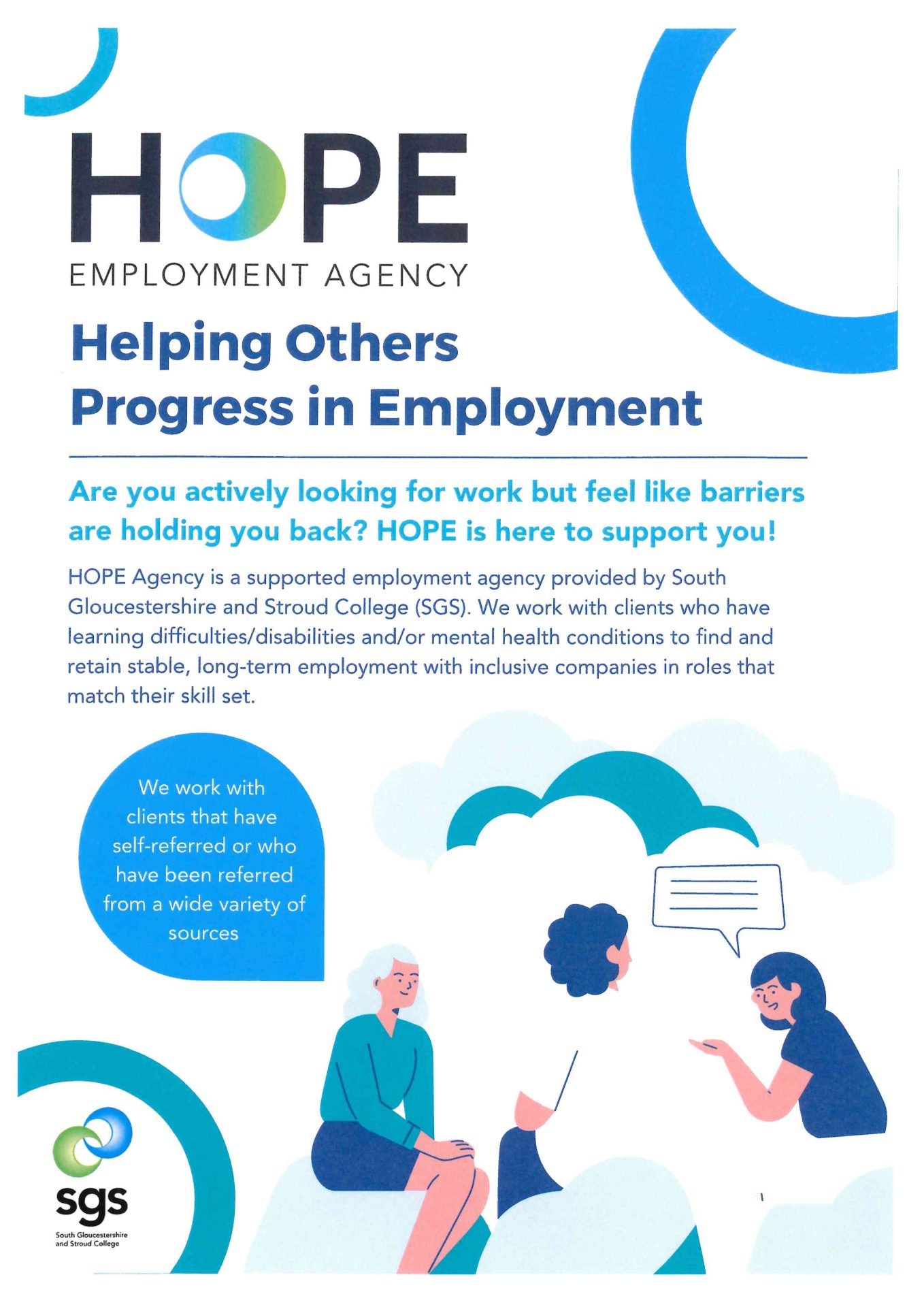 HOPE (Helping Others Progress in Employment) Agency is a supported employment agency provided by South Gloucestershire and Stroud College (SGS).